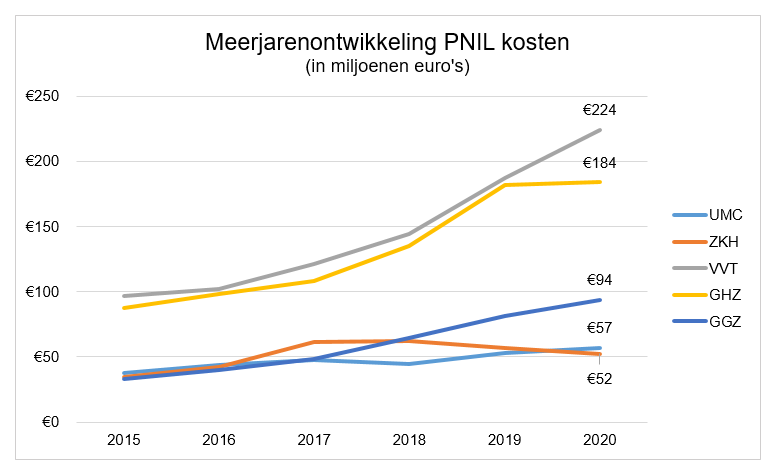 De ontwikkeling van de PNIL-kosten over de jaren heen verloopt niet elke branche hetzelfde. De ziekenhuizen laten als enige branche een opvallende daling in hun PNIL-kosten zien: een afname van bijna 10 miljoen euro in de afgelopen twee jaar. Ook in de gehandicaptenzorg lijkt de stijging voor het eerst af te vlakken. In de overige sectoren wordt de stijgende lijn van de afgelopen jaren daarentegen doorgezet, al is de toename van de PNIL-kosten in 2020 dus wel minder sterk.